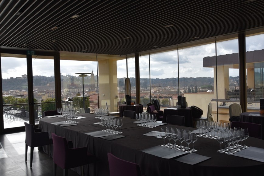 Enrico mi ha proposto come luogo di degustazione il ristorante Sesto dell’Hotel The Westin Excelsior. Si tratta di un ristorante che è ubicato al sesto ed ultimo piano dell’Hotel, con una vista su Firenze a 360 gradi. E’ un posto magnifico dove non si può non andare venendo a Firenze. Per la degustazione avremmo avuto un salone tutto vetri e tutto luce e panorama. Magnifico!